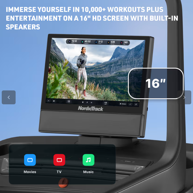The Nordic Track X16 Incline Treadmill is one of the most versatile treadmills on the market as its one running machine that provides numerous workout options. Walk, run and hike, then use the screen to do a range of floor exercises from strength, yoga and more. This award winning treadmill provides a heart pounding 40% incline to -6% decline for more training variety. With such a steep incline and a speed range of 0-20km/h (0-12.5mph) powered by a 4.25 CHP motor, you need an excellent cushioned deck and this is one of the softest and most comfortable of all Nordic Tracks running surfaces. Of course what Nordic Track is famous for is its iFit Pro Software which requires a subscription and WiFi but once you have access you will never get bored with the worlds largest outdoor workout library of 10,000 workouts and counting. All this is displayed on an immersive, crystal clear 16” (40.6cm) Touchscreen. In addition you have an Autobreeze™ fan that automatically adjusts with the intensity of your workout to keep you cool and change speed and incline quickly with on screen shortcut buttons.