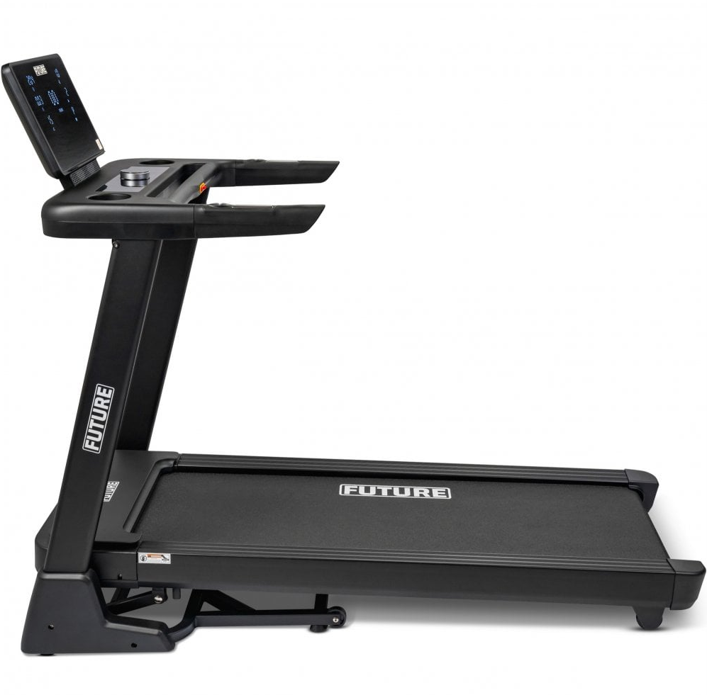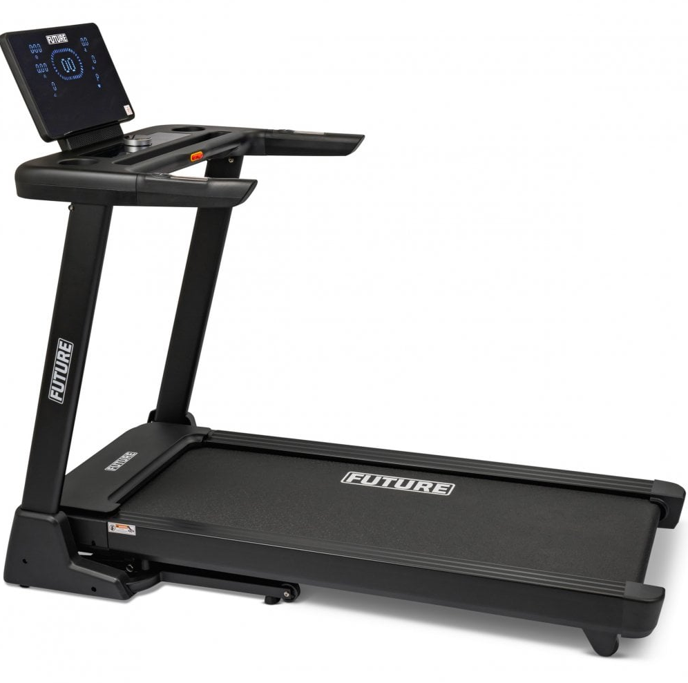 The Future T440 Folding Treadmill is the second treadmill in the Future Home Treadmill Range and is the perfect solution for those requiring a little more than the Future T330 treadmill can offer. Its larger 130cm x 48cm (51” x 19”) running belt allows for taller users with longer strides and the electronic elevation can raise the treadmill deck to a 15% incline, resulting in a challenging workout. Intuitive quick speed and incline keys enable you to adjust your pace and gradient seamlessly while exercising.The treadmills built in Bluetooth is compatible with most major fitness apps, all you need is a smart device but the large backlit LCD console still provides 15 pre-set programmes. The heart rate monitoring pulse grips on the handrails keeps you within your training zone, without any disruption to your workout. Convenient cup holders offers storage for your personal items, always keeping them within easy reach. When you workout is over, fold the treadmill away and if required it can be moved to another area on its transport wheels.