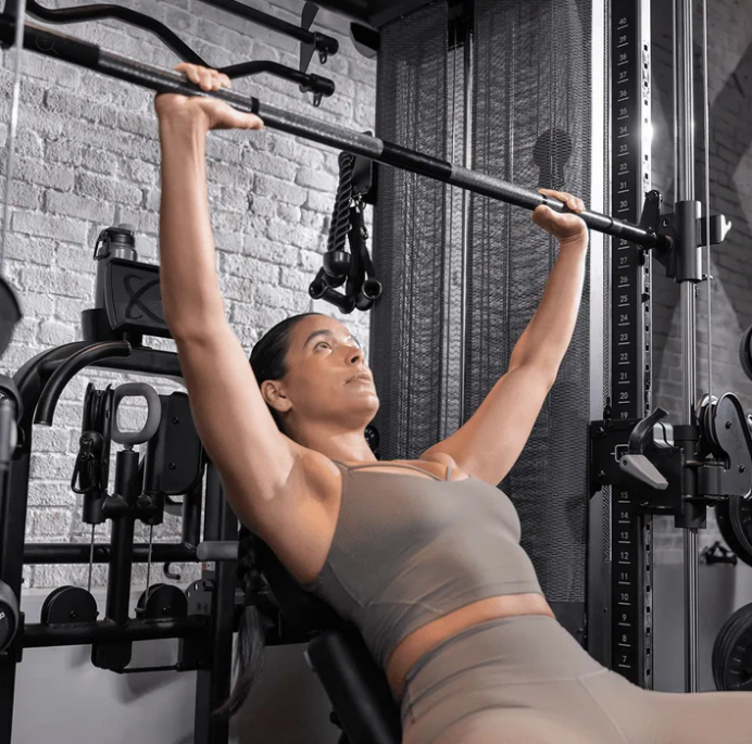 - Dual High Pulleys with three height options available to accommodate user heights and ceiling heights.